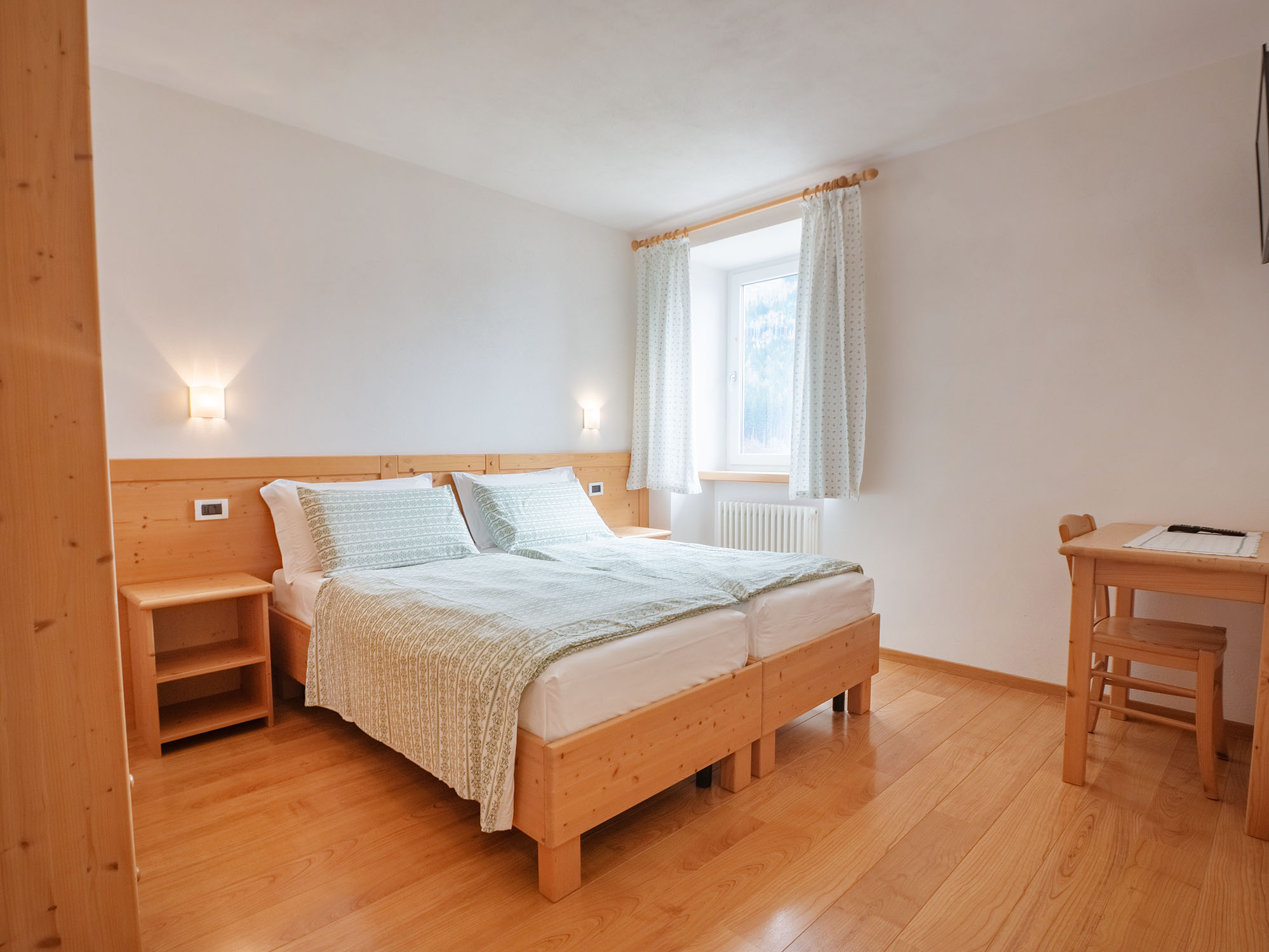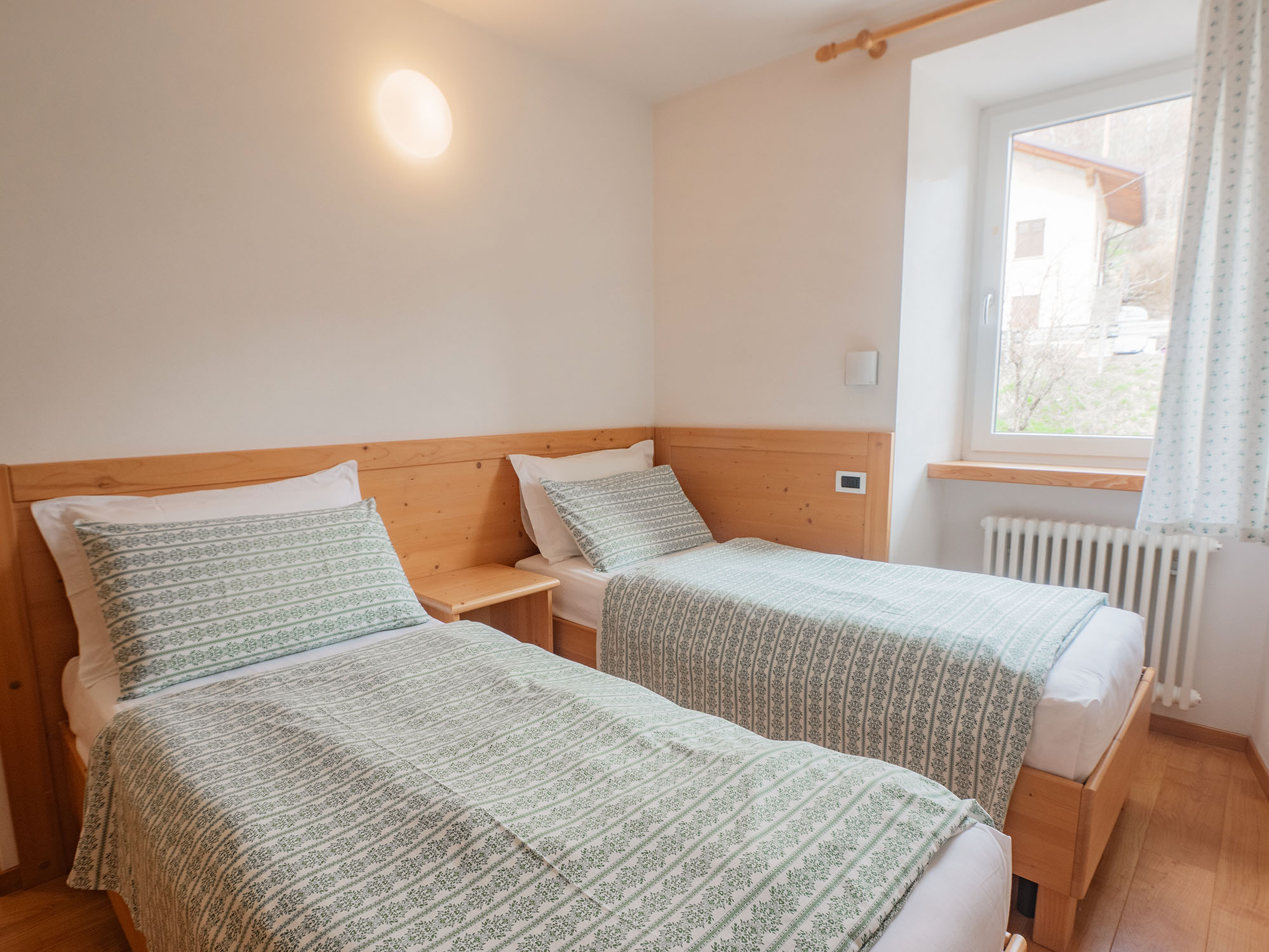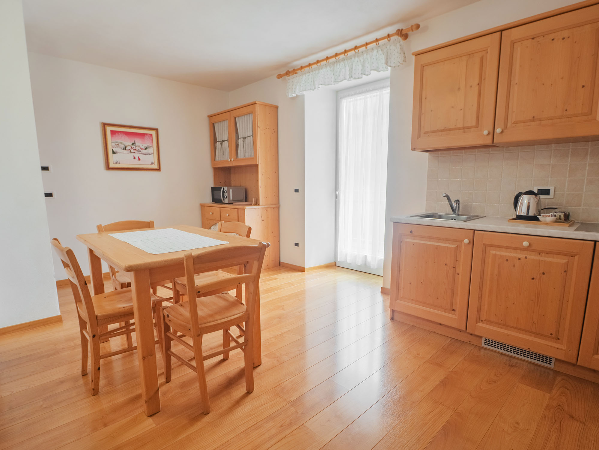 Appartamento luminoso e panoramico. Adatto a famiglie o gruppi di amici di 3 o 4 persone. Composto da 2 camere da letto, bagno finestrato e cucina abitabile con balcone rivolto verso il lago. L’arredamento è in stile tipico trentino con mobili in legno e tessuti naturali.